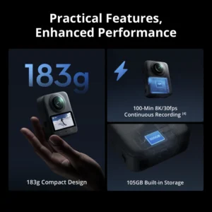 Native 8K 360° video from dual 1/1.1″ sensors; 120MP 360 photos, 10-bit color with D-Log M